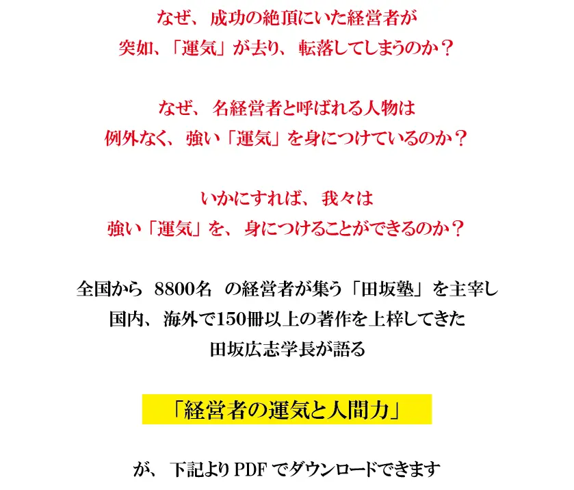 2025.10.01 田坂広志学長の最新論考 「経営者の運気と人間力」 がForbes JAPANに掲載。経営者やリーダーに求められる究極の力、「運気を引き寄せる力」とは何か、を語りました。 最新論考はこちらからご覧いただけます メールはこちらへ 全文はこちら(PDF) 田坂広志アカデメイア 公式HP 学校法人 21世紀アカデメイア公式HP メールはこちらへ 問い合わせはこちらのフォームから