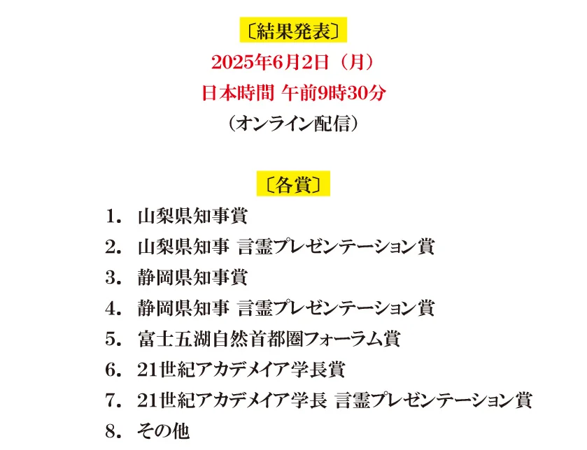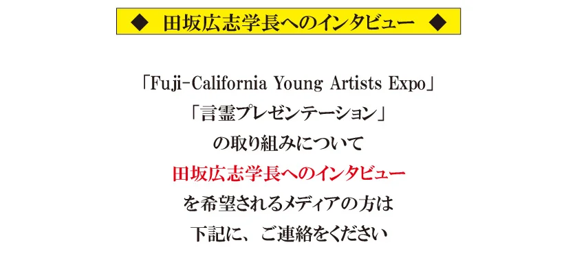 2025.04.11 100カ国の学生とともに、社会課題への想いを発信。「言霊プレゼンテーション」作品募集中!【21世紀アカデメイアが提唱する新しいプレゼンテーションのスタイル】 作品規定はこちら 応募はこちらから 公式HP(英語サイト) 公式HP(英語サイト) カリフォルニア招待訪問について 「ECSAIT」について インタビューのご希望はこちらから メールはこちらへ 問い合わせはこちらのフォームから