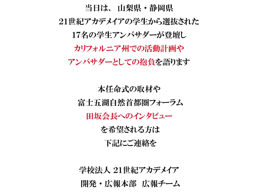 2025.09.24 学生が、アートによる国際交流と日本文化の深みを世界に紹介!カリフォルニア州を訪問する学生アンバサダーの任命式を、10月7日、山梨県知事、静岡県知事も登壇して開催 メールはこちらへ 富士五湖自然首都圏フォーラム 公式HP 学校法人 21世紀アカデメイア公式HP メールはこちらへ 問い合わせはこちらのフォームから